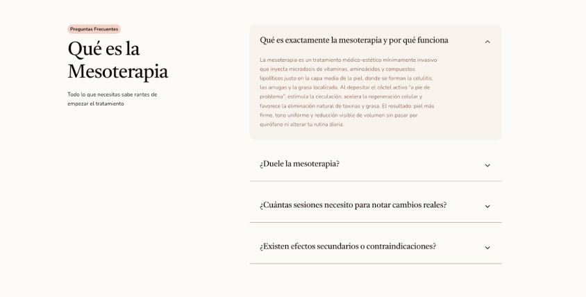 Paula GarcíaMar y Arena AestheticsThe website texts answer exactly my patients' doubts: does it hurt, how much does it cost, how long does it last. The copy is made by someone who understands the sector.